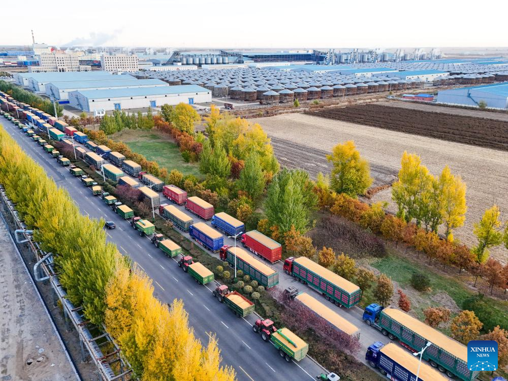 An aerial drone photo taken on Oct. 15, 2025 shows trucks loaded with newly harvested grains queuing up at a grain collection and storage enterprise in Jiamusi City, northeast China's Heilongjiang Province. The autumn harvest in Heilongjiang, China's top grain producer, has been in full swing. As of Oct. 14, Heilongjiang had completed the harvesting of approximately 153.60 million mu (10.24 million hectares) of autumn grain crops, accounting for over 60 percent of the total. (Photo by Qu Yubao/Xinhua)