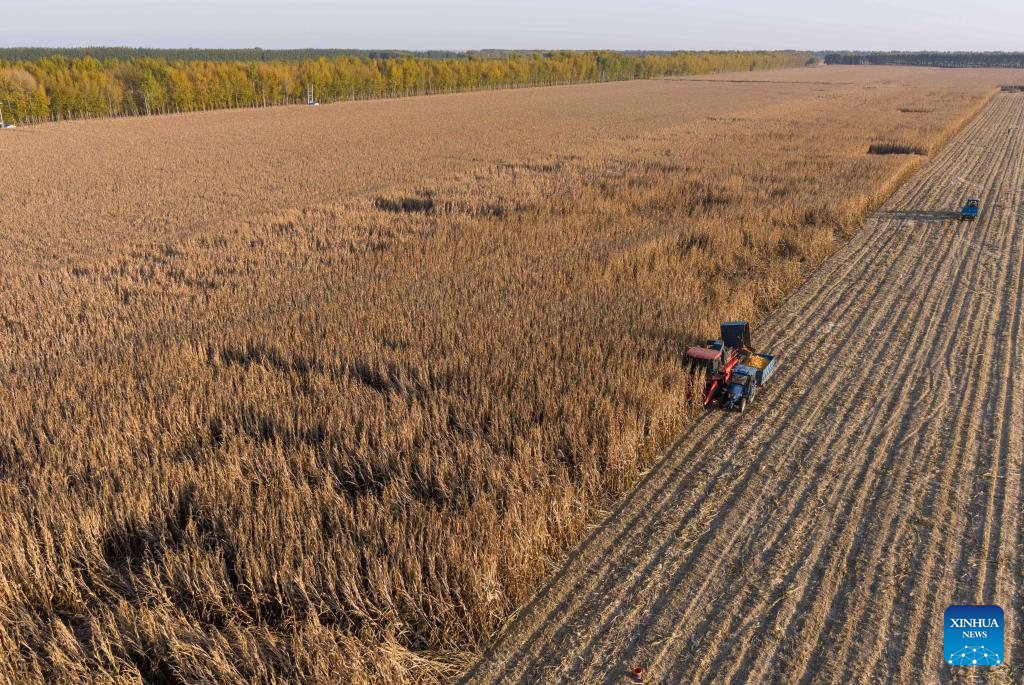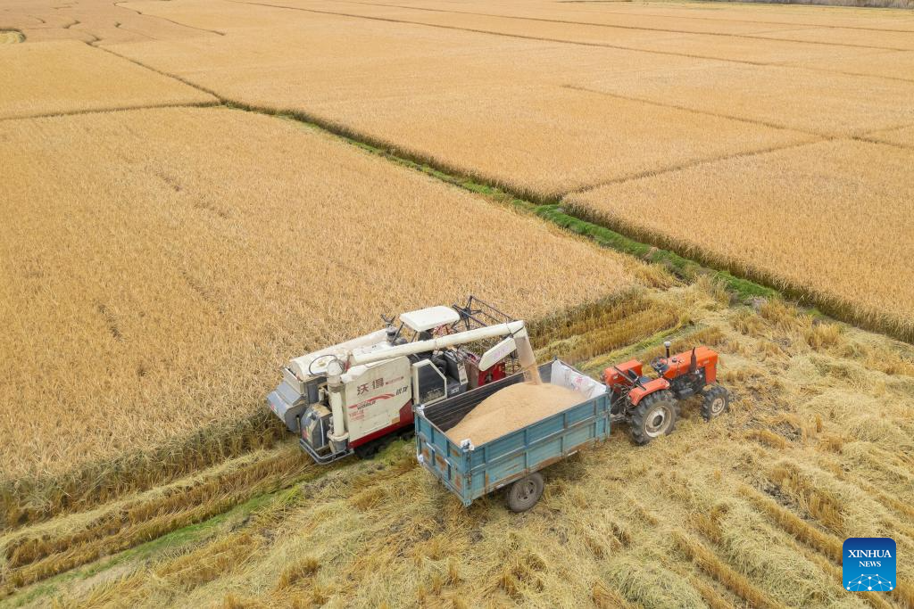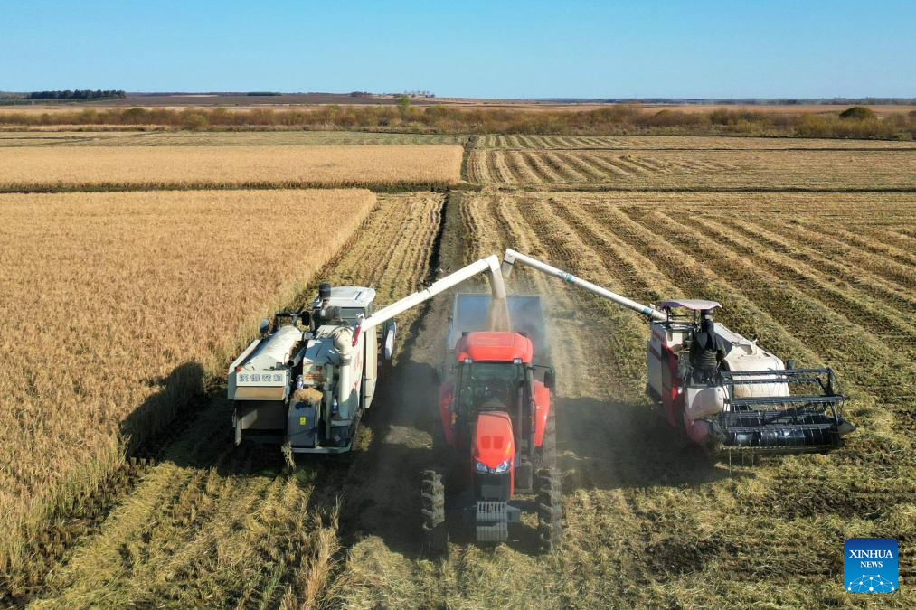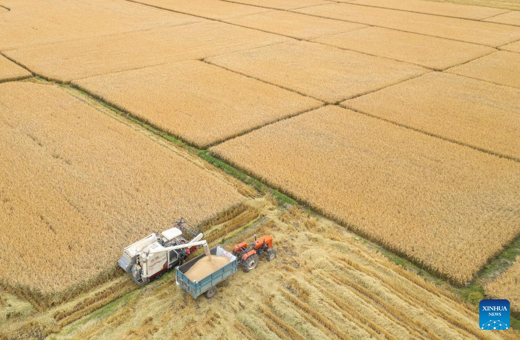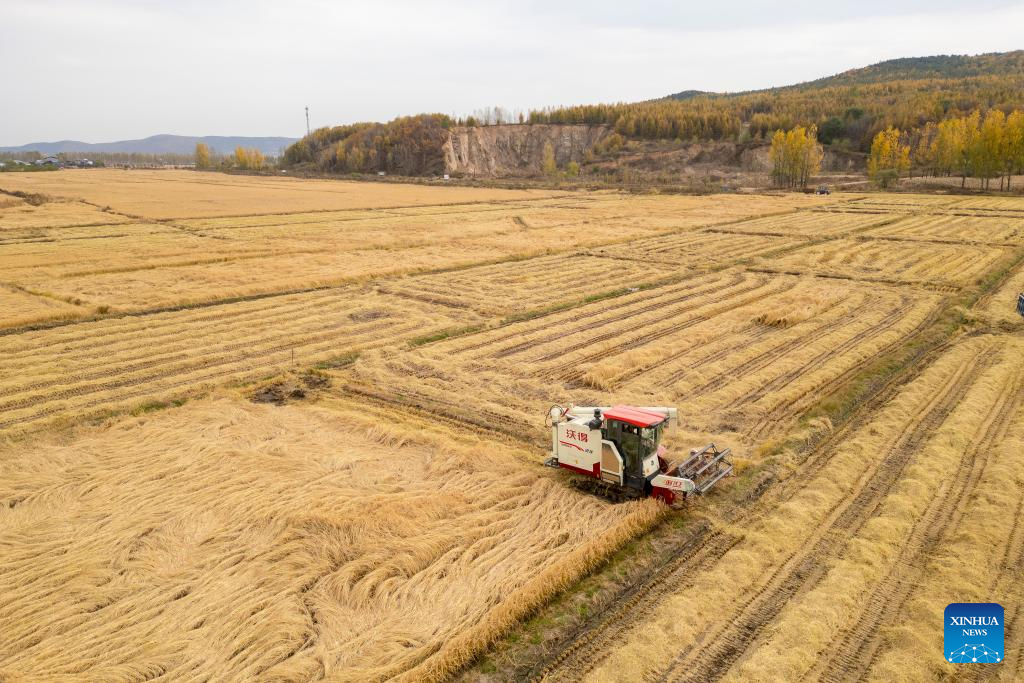 An aerial drone photo taken on Oct. 14, 2025 shows a farmer preparing for harvest in Mudanjiang City, northeast China's Heilongjiang Province. The autumn harvest in Heilongjiang, China's top grain producer, has been in full swing. As of Oct. 14, Heilongjiang had completed the harvesting of approximately 153.60 million mu (10.24 million hectares) of autumn grain crops, accounting for over 60 percent of the total. (Xinhua/Zhang Tao)