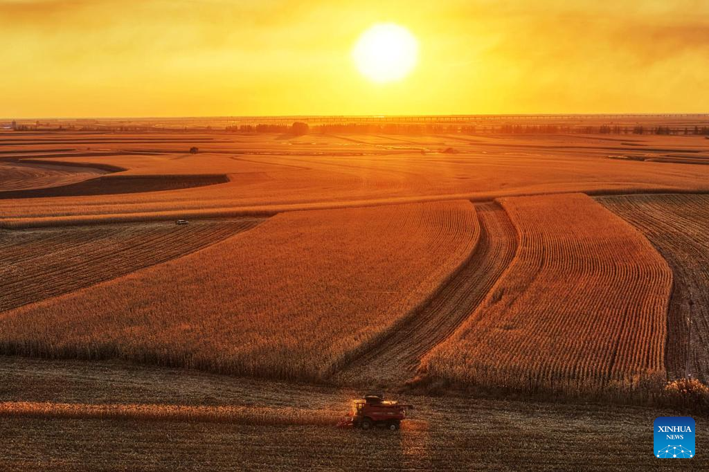 An aerial drone photo taken on Oct. 14, 2025 shows a scene of harvest under the sunset in Jiamusi City, northeast China's Heilongjiang Province. The autumn harvest in Heilongjiang, China's top grain producer, has been in full swing. As of Oct. 14, Heilongjiang had completed the harvesting of approximately 153.60 million mu (10.24 million hectares) of autumn grain crops, accounting for over 60 percent of the total. (Photo by Liu Wanping/Xinhua)