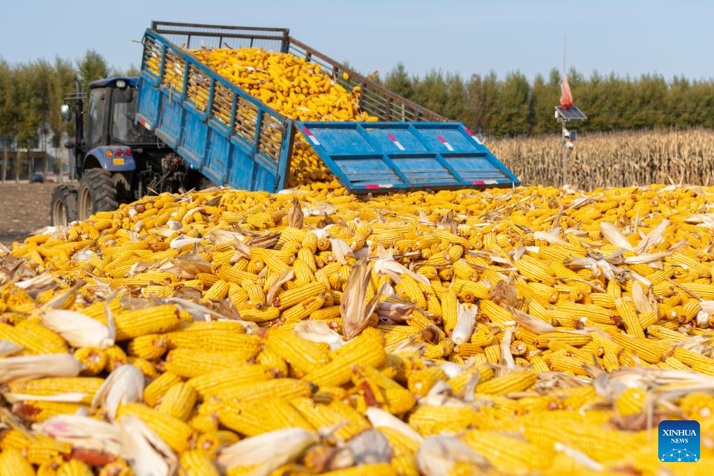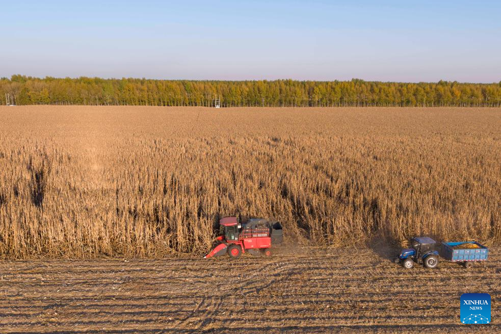 An aerial drone photo taken on Oct. 14, 2025 shows farmers harvesting corns in Suihua City, northeast China's Heilongjiang Province. The autumn harvest in Heilongjiang, China's top grain producer, has been in full swing. As of Oct. 14, Heilongjiang had completed the harvesting of approximately 153.60 million mu (10.24 million hectares) of autumn grain crops, accounting for over 60 percent of the total. (Xinhua/Xie Jianfei)