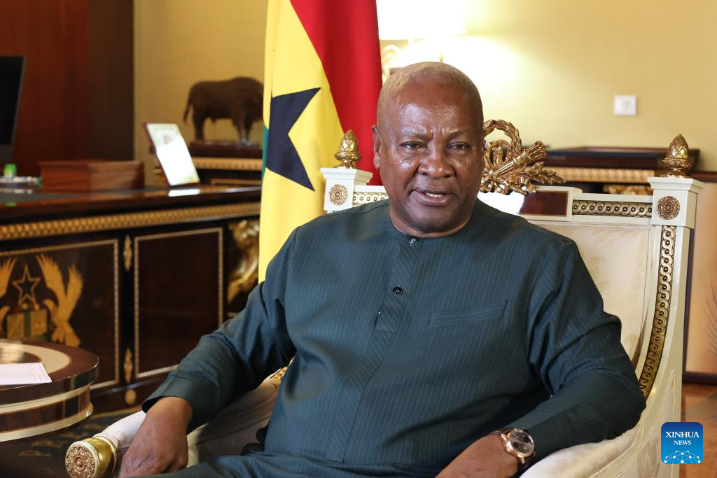 Ghanaian President John Dramani Mahama speaks during an interview with Xinhua at the Ghanaian Presidency in Accra, Ghana, Oct. 9, 2025.(Photo by Seth/Xinhua)