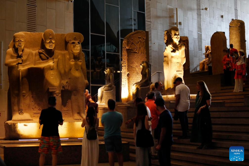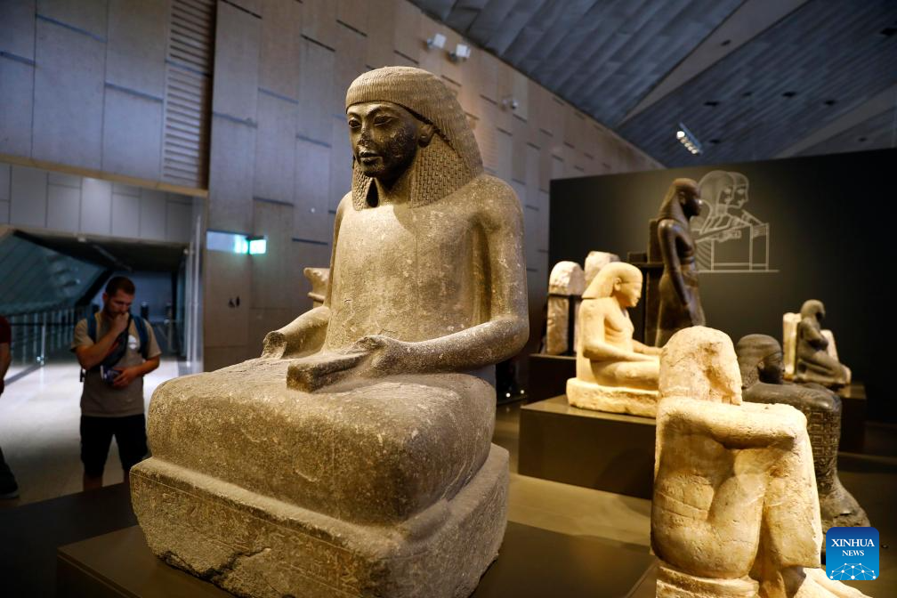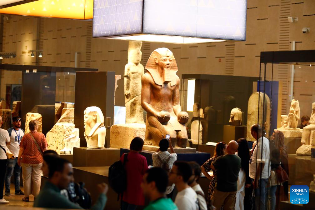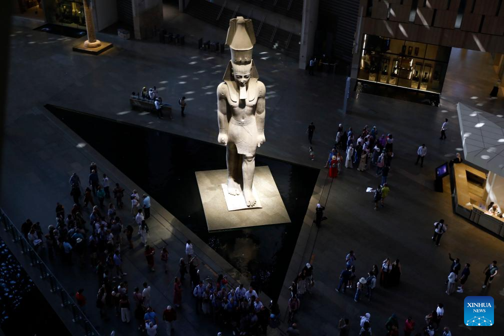 Tourists view exhibits at the Grand Egyptian Museum in Giza, Egypt, Oct. 14, 2025. Egypt's Grand Egyptian Museum (GEM) is temporarily closed to the public from Oct. 15 to Nov. 3 in preparation for its official opening, scheduled for early November, according to an announcement published Monday on the museum's official website. (Xinhua/Ahmed Gomaa)