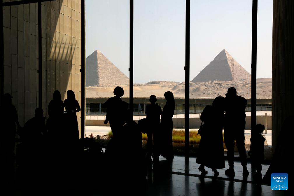Tourists view the Giza Pyramids while visiting the Grand Egyptian Museum in Giza, Egypt, Oct. 14, 2025. Egypt's Grand Egyptian Museum (GEM) is temporarily closed to the public from Oct. 15 to Nov. 3 in preparation for its official opening, scheduled for early November, according to an announcement published Monday on the museum's official website. (Xinhua/Ahmed Gomaa)