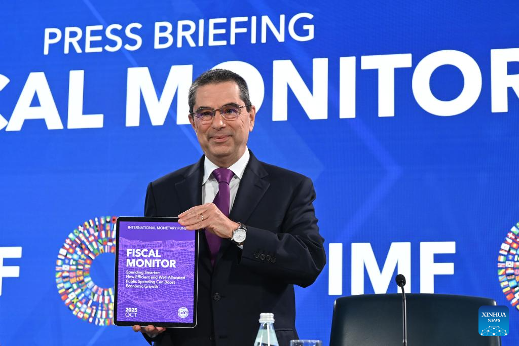 This photo taken on Oct. 15, 2025 shows a press briefing on the IMF release of Fiscal Monitor in Washington, D.C., the United States. In the latest Fiscal Monitor released Wednesday, the IMF argued that enhancing spending efficiency can magnify gains "substantially," and alleviate the fiscal policy trilemma. (Xinhua/Li Rui)