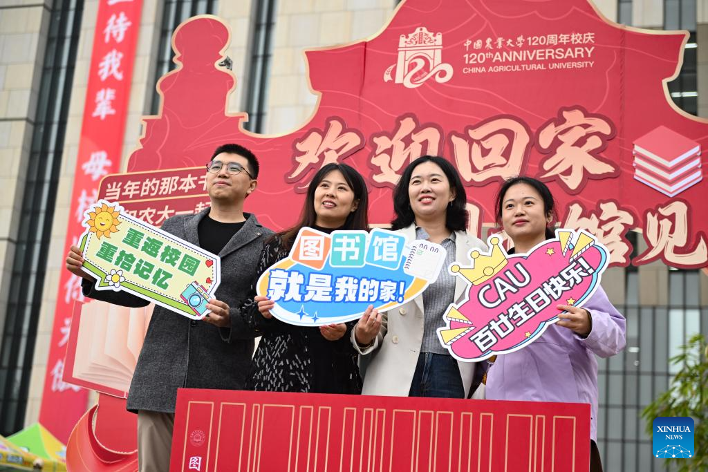 Alumni pose for photos in front of the library at a campus of China Agricultural University in Beijing, capital of China, Oct. 16, 2025. The China Agricultural University on Thursday hosted a series of events to mark the 120th anniversary of its founding. (Xinhua/Chen Zhonghao)