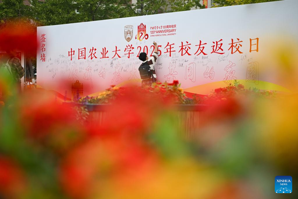 This photo taken on Oct. 16, 2025 shows the signature wall for home-coming alumni on the occasion of the 120th anniversary of the founding of China Agricultural University in Beijing, capital of China. The China Agricultural University on Thursday hosted a series of events to mark the 120th anniversary of its founding. (Xinhua/Chen Zhonghao)