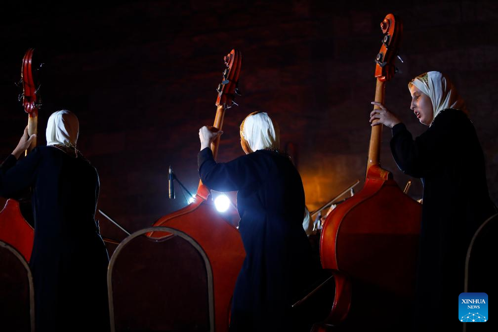 Blind female musicians from Egypt's Al Nour Wal Amal (Light and Hope) Chamber Orchestra perform at the Al-Ghouri Palace to mark the White Cane Safety Day in Cairo, Egypt, Oct. 15, 2025. The White Cane Safety Day is celebrated annually on Oct. 15 each year. (Xinhua/Ahmed Gomaa)