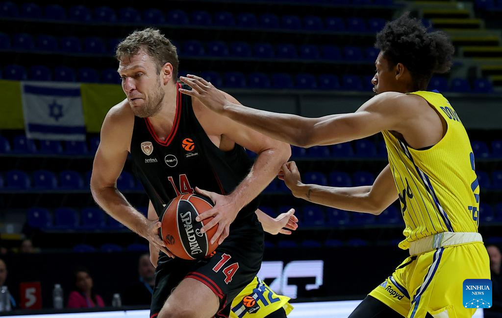 Tyler Dorsey (R) of Olympiacos vies with Maccabi's Tamir Blatt during the regular season round 5 Euroleague basketball match between Maccabi Tel-Aviv and Olympiacos in Belgrade, Serbia, Oct. 16, 2025. (Photo by Predrag Milosavljevic/Xinhua)