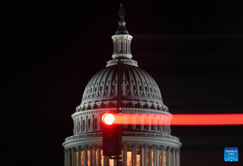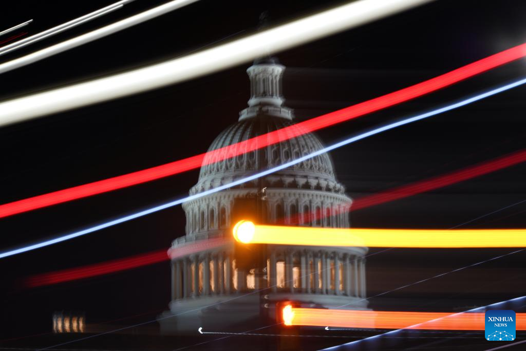 This long-exposure photo taken on Oct. 15, 2025 shows the U.S. Capitol building in Washington, D.C., the United States. (Xinhua/Li Rui)