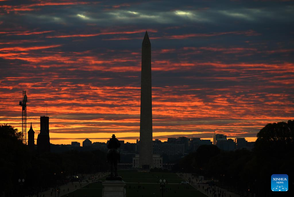 The Washington Monument is silhouetted against sunset in Washington, D.C., the United States, on Oct. 15, 2025. (Xinhua/Li Rui)