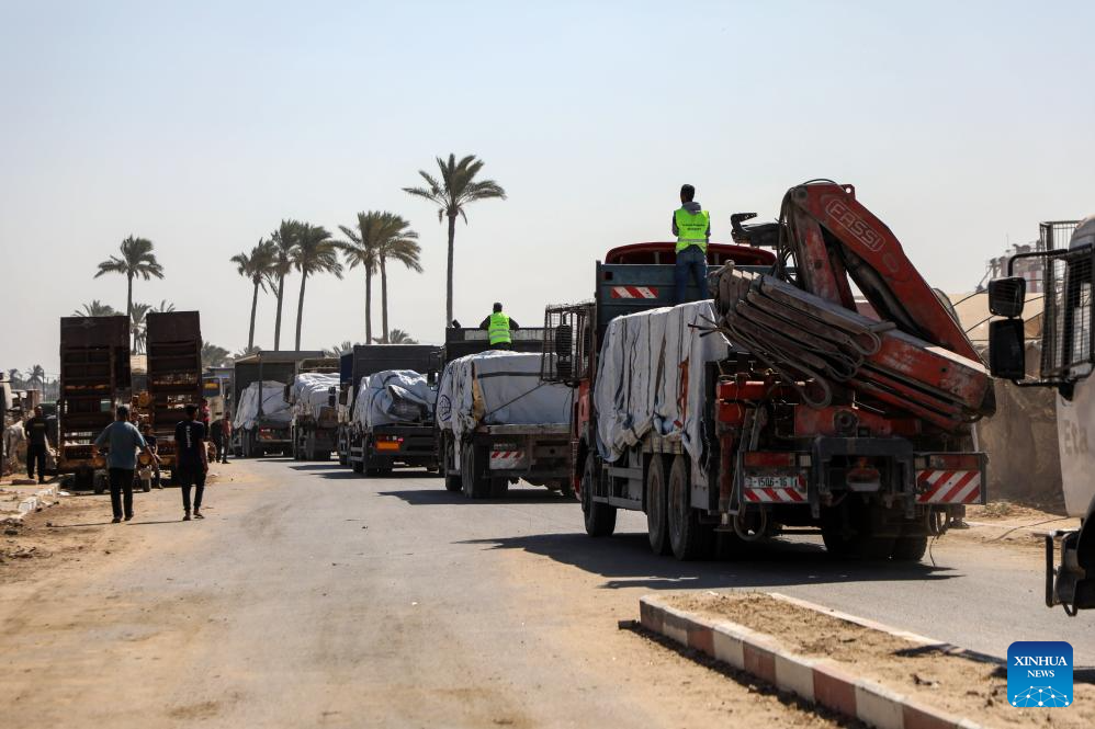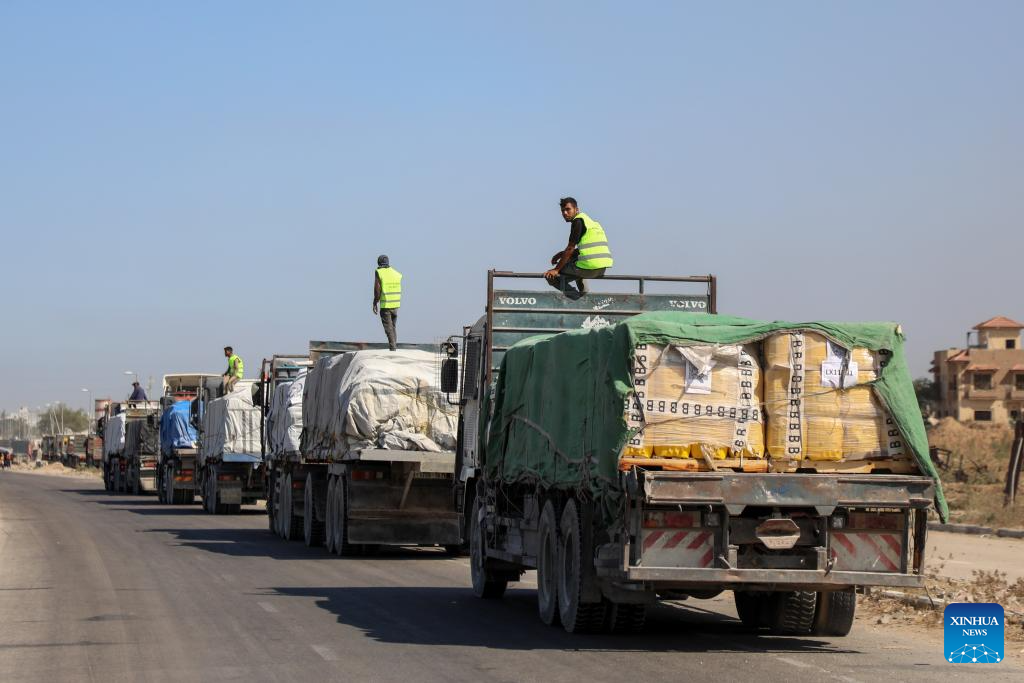 Trucks carrying aid supplies are seen in Deir al-Balah, central Gaza Strip, on Oct. 16, 2025. A whole convoy of aid trucks from the World Food Programme has managed to get to a warehouse in Gaza without being looted, and there has been a dramatic drop in looting incidents, a UN spokesperson said Thursday. (Photo by Rizek Abdeljawad/Xinhua)