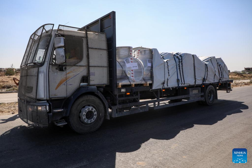 A truck carrying aid supplies is seen in Deir al-Balah, central Gaza Strip, on Oct. 16, 2025. A whole convoy of aid trucks from the World Food Programme has managed to get to a warehouse in Gaza without being looted, and there has been a dramatic drop in looting incidents, a UN spokesperson said Thursday. (Photo by Rizek Abdeljawad/Xinhua)