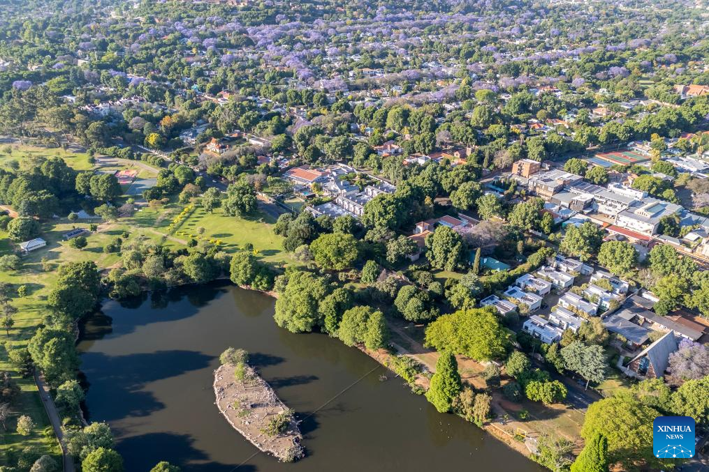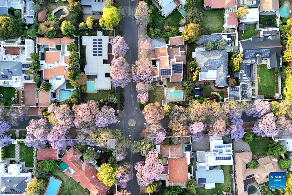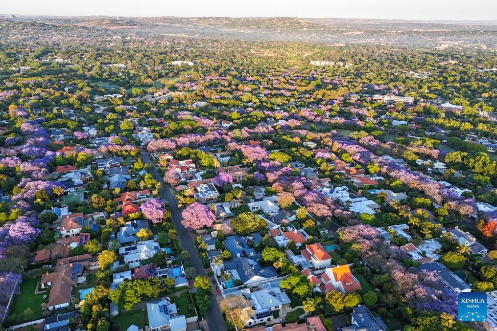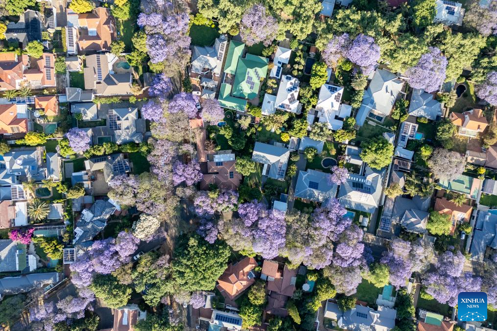 An aerial drone photo taken on Oct. 16, 2025 shows blooming jacaranda trees in Johannesburg, South Africa. The jacaranda trees here bloom from mid-October to early November each year. (Photo by Shiraaz Mohamed/Xinhua)