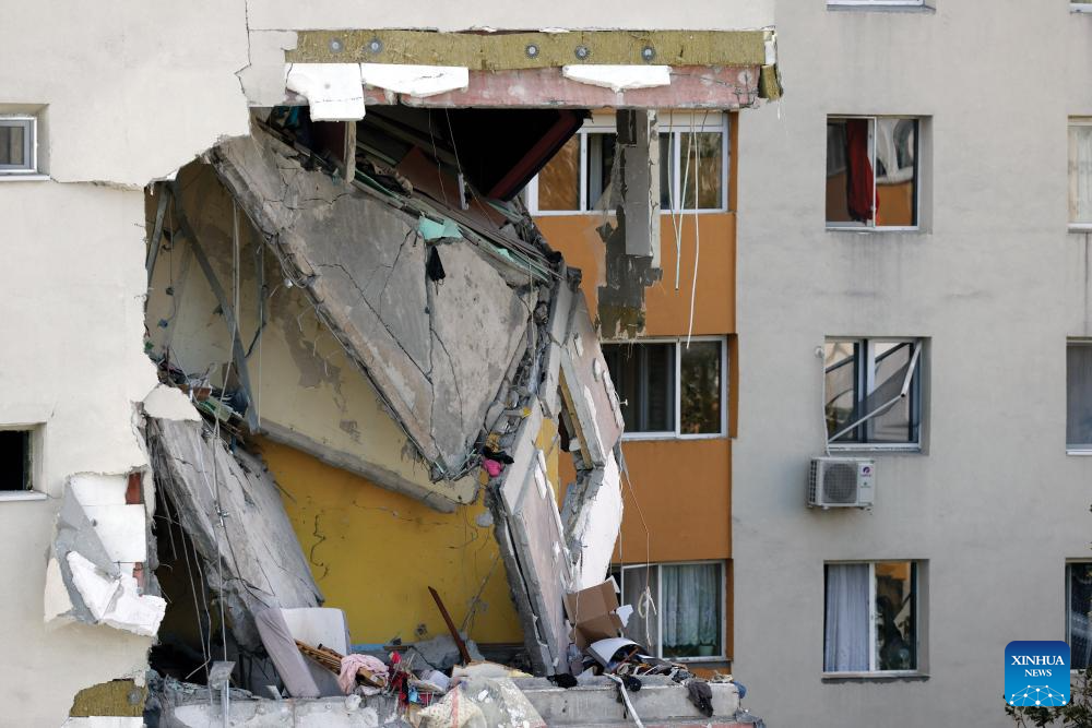 A residential building hit by an explosion is pictured in Bucharest, Romania, Oct. 17, 2025. Three people were killed and at least 13 others injured after an explosion ripped through an apartment block in the Romanian capital here on Friday, authorities said. (Photo by Cristian Cristel/Xinhua)