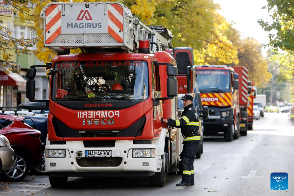 Firefighters are seen on a street in the restricted area near a residential building hit by an explosion in Bucharest, Romania, Oct. 17, 2025. Three people were killed and at least 13 others injured after an explosion ripped through an apartment block in the Romanian capital here on Friday, authorities said. (Photo by Cristian Cristel/Xinhua)