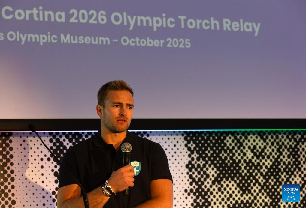 First torchbearer Alexandros Ginnis speaks during a press conference on the preparations for the Olympic flame lighting and handover ceremonies, in Athens, Greece, Oct. 16, 2025. Greek water polo athlete Eleni Xenaki will be the last torchbearer on Greek soil for the 2026 Milano-Cortina winter Olympic Games, the Hellenic Olympic Committee (HOC) said during the press conference held in Athens on Thursday. Greek alpine skier Alexandros Ginnis will start the torch relay at the end of the Olympic flame lighting ceremony which will be held on Nov. 26 at ancient Olympia, in western Greece, the birthplace of the Olympic Games. (Photo by Marios Lolos/Xinhua)