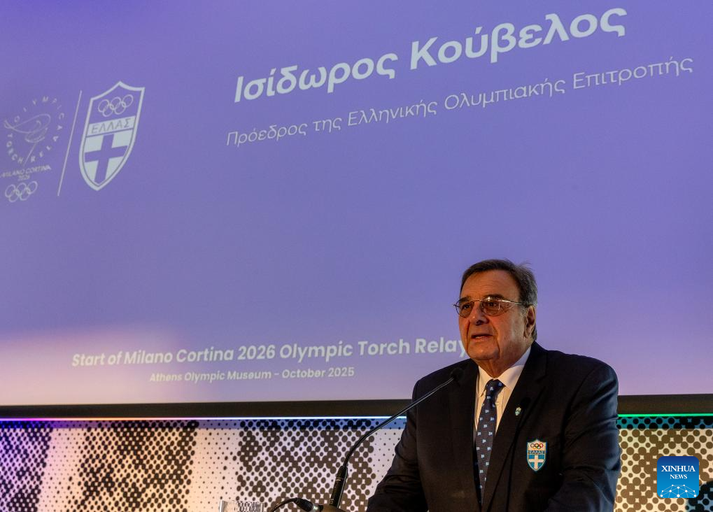 Isidoros Kouvelos, president of the Hellenic Olympic Committee, speaks during a press conference on the preparations for the Olympic flame lighting and handover ceremonies, in Athens, Greece, Oct. 16, 2025. Greek water polo athlete Eleni Xenaki will be the last torchbearer on Greek soil for the 2026 Milano-Cortina winter Olympic Games, the Hellenic Olympic Committee (HOC) said during the press conference held in Athens on Thursday. Greek alpine skier Alexandros Ginnis will start the torch relay at the end of the Olympic flame lighting ceremony which will be held on Nov. 26 at ancient Olympia, in western Greece, the birthplace of the Olympic Games. (Photo by Marios Lolos/Xinhua)
