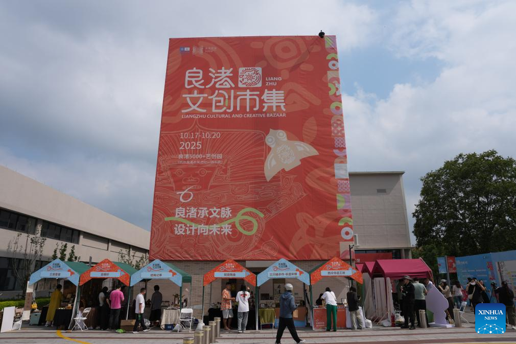 This photo taken on Oct. 17, 2025 shows a view of the outdoor exhibition area of Liangzhu Cultural and Creative Bazaar in Hangzhou, east China's Zhejiang Province. The bazaar opened here on Friday. It features activities such as exhibitions, panel discussions and fashion shows, showcasing cultural and creative achievements from China and abroad. (Xinhua/Huang Zongzhi)