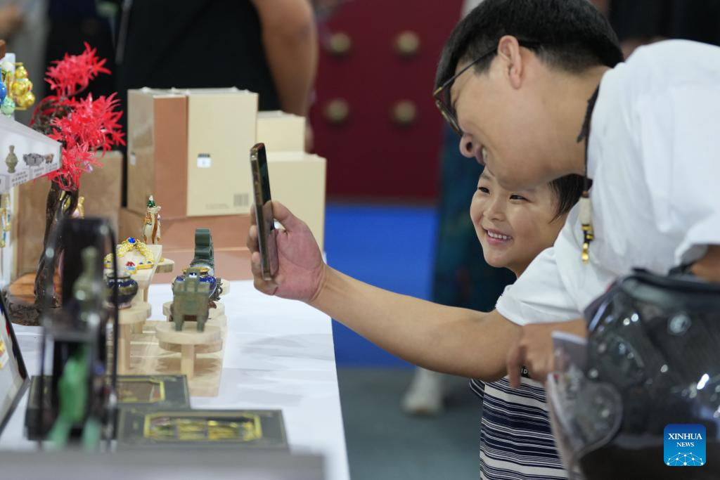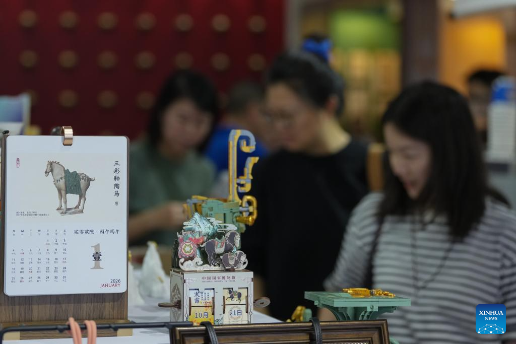 People visit the booth of the National Museum of China at Liangzhu Cultural and Creative Bazaar in Hangzhou, east China's Zhejiang Province, Oct. 17, 2025. The bazaar opened here on Friday. It features activities such as exhibitions, panel discussions and fashion shows, showcasing cultural and creative achievements from China and abroad. (Xinhua/Huang Zongzhi)