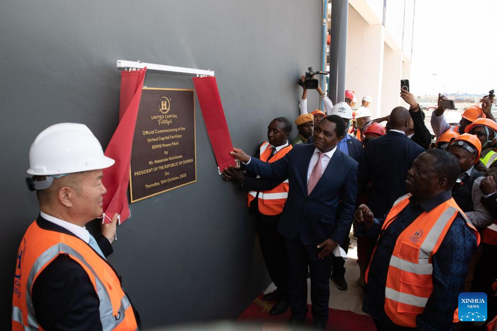 Zambian President Hakainde Hichilema (C) unveils a 85MW power plant of a China-built fertilizer plant in Chilanga district, Lusaka Province, Zambia, Oct. 16, 2025. Zambia on Thursday commissioned a fertilizer manufacturing plant constructed by a Chinese firm, marking a major step in the country's efforts to become self-sufficient in fertilizer production.
