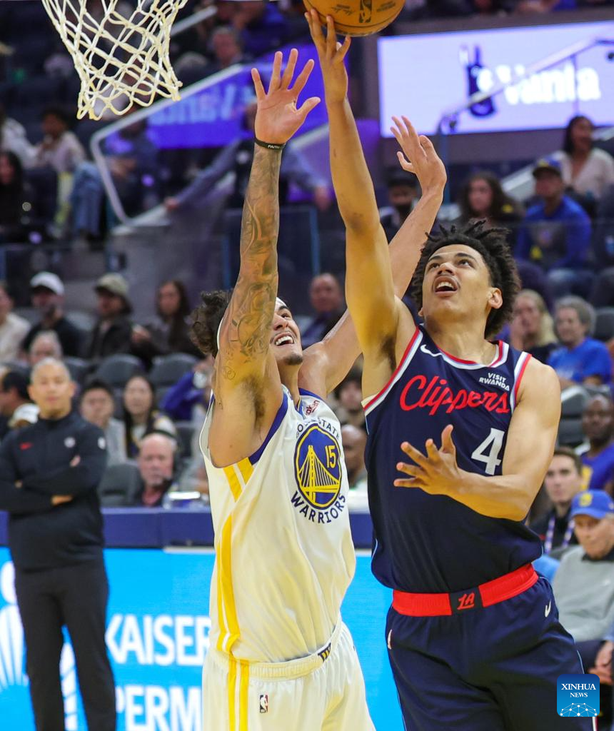 Kobe Sanders (R) of Los Angeles Clippers goes for a layup during the 2025-2026 NBA preseason game between Golden State Warriors and Los Angeles Clippers in San Francisco, the United States, on Oct. 17, 2025. (Photo by Arthur Dong/Xinhua)