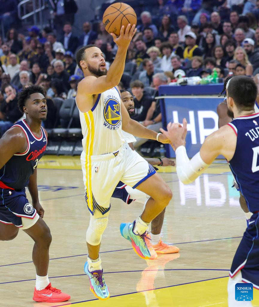 Stephen Curry (C) of Golden State Warriors goes for a layup during the 2025-2026 NBA preseason game between Golden State Warriors and Los Angeles Clippers in San Francisco, the United States, on Oct. 17, 2025. (Photo by Arthur Dong/Xinhua)