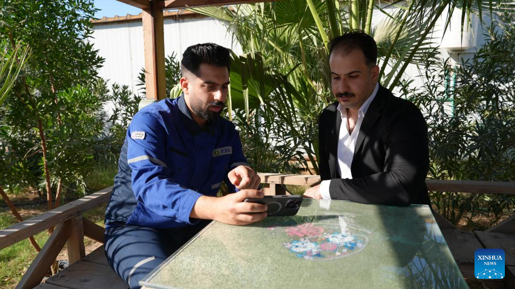 Ali Maher (L), one of the first batch of Iraqi students under the Zhenhua Oil Scholarship Program, shares his study experience in China with Mahdi Salah, who is about to study in China, at the EBS Oilfield in Iraq, Oct. 11, 2025. (Xinhua/Duan Minfu)
