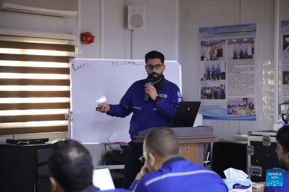 Ali Maher, one of the first batch of Iraqi students under the Zhenhua Oil Scholarship Program, shares his study experience and insights into Chinese culture in a lecture at the EBS Oilfield in Iraq, Oct. 13, 2025. (Xinhua)