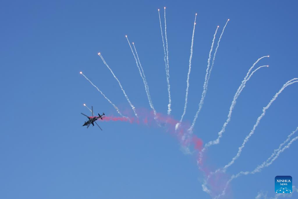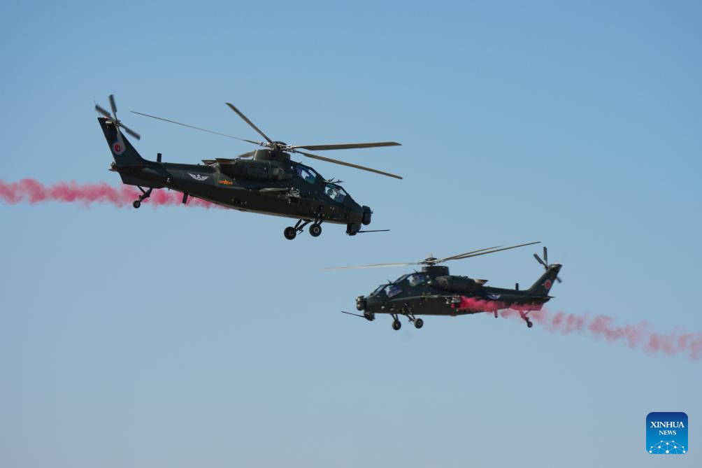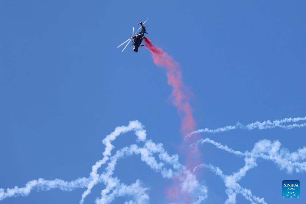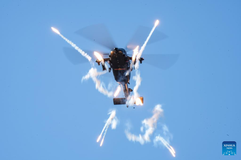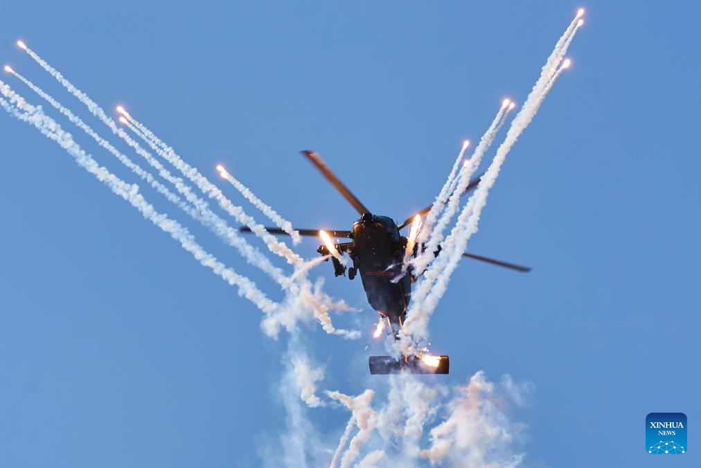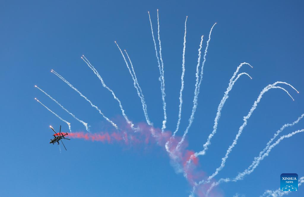 A Z-10 helicopter performs during the 7th China Helicopter Exposition in north China's Tianjin Municipality, Oct. 18, 2025. The exposition opened to the general public on Saturday. (Xinhua/Sun Fanyue)