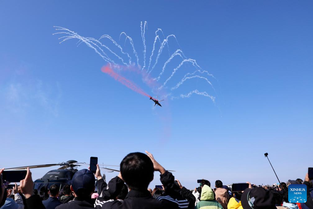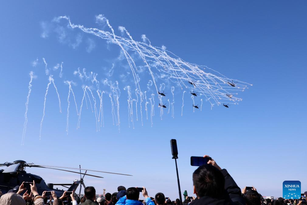 People watch an aircraft performance during the 7th China Helicopter Exposition in north China's Tianjin Municipality, Oct. 18, 2025. The exposition opened to the general public on Saturday. (Xinhua/Li Ran)