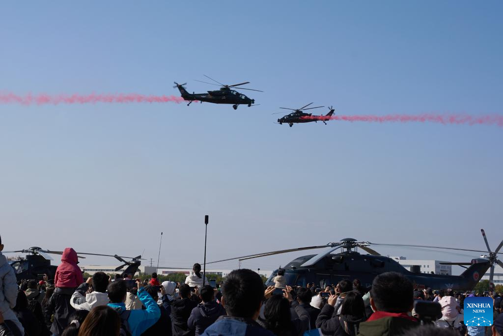 A Z-10 helicopter performs during the 7th China Helicopter Exposition in north China's Tianjin Municipality, Oct. 18, 2025. The exposition opened to the general public on Saturday. (Xinhua/Zhao Zishuo)