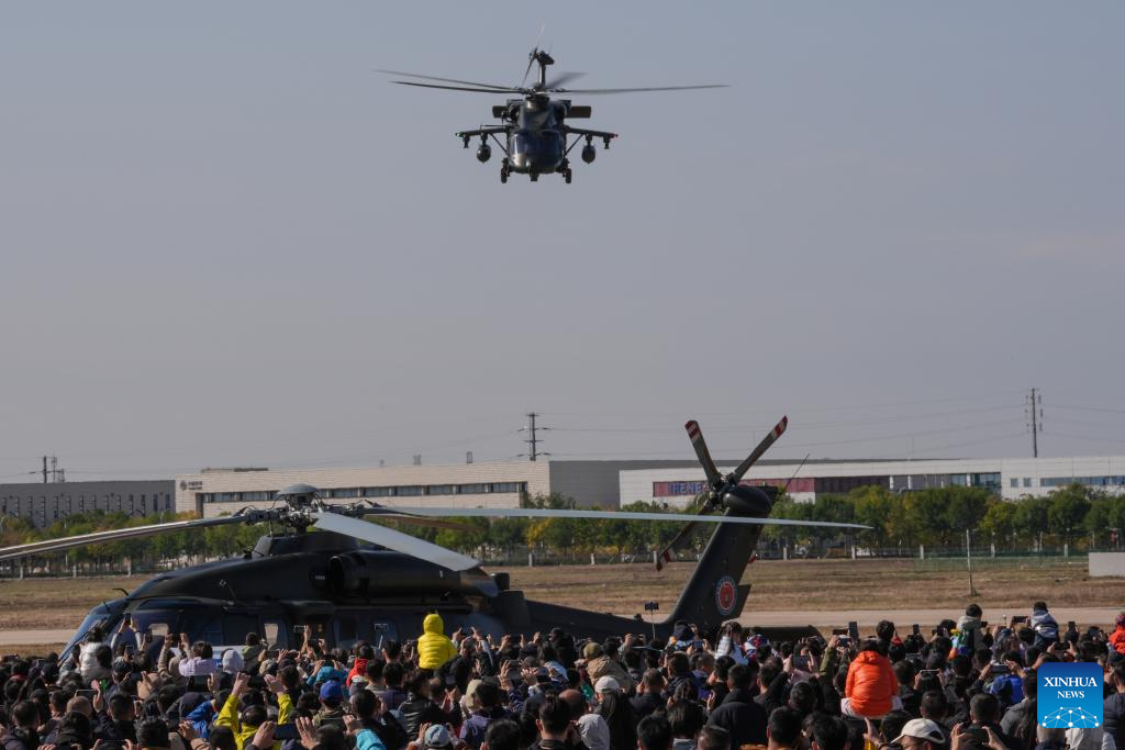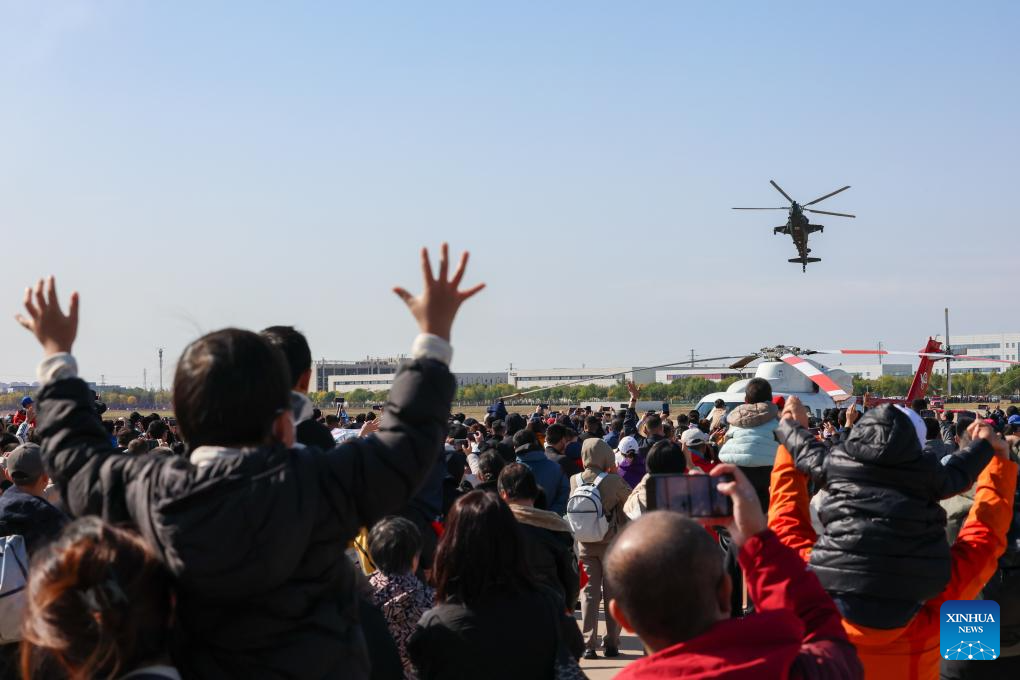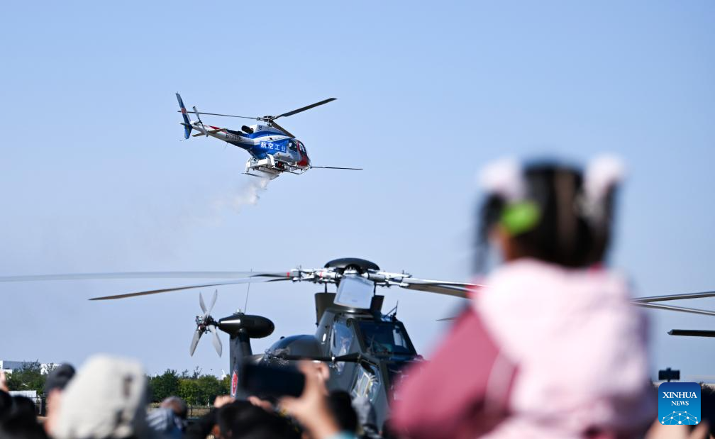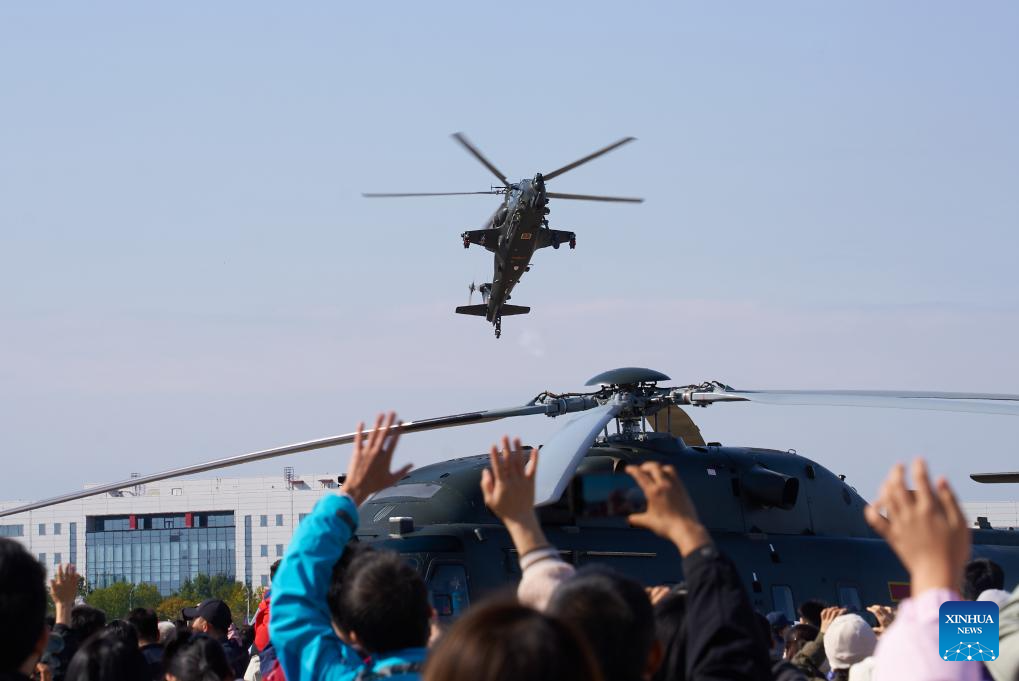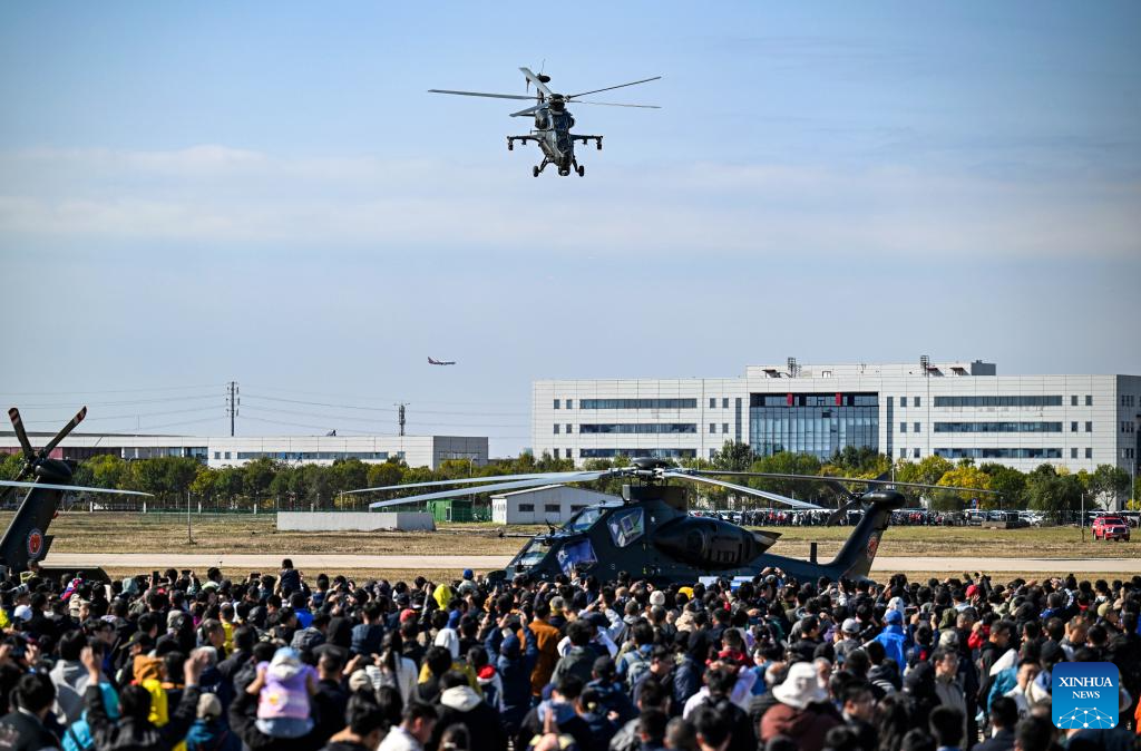 People watch as a Z-10 helicopter finishes a performance during the 7th China Helicopter Exposition in north China's Tianjin Municipality, Oct. 18, 2025. The exposition opened to the general public on Saturday. (Xinhua/Sun Fanyue)