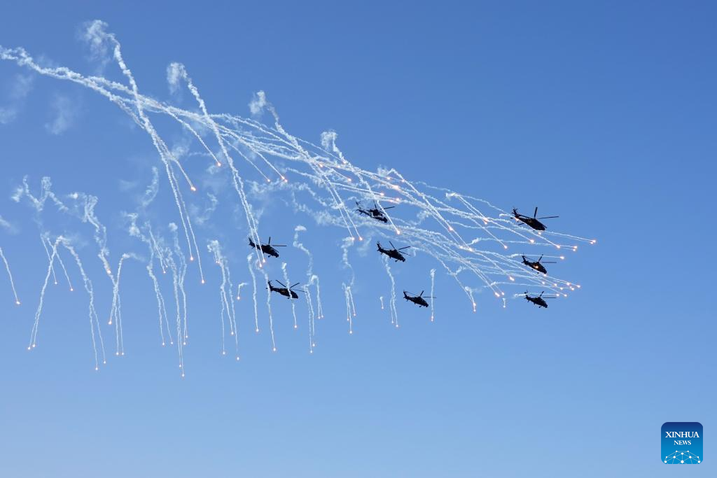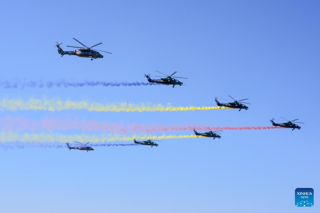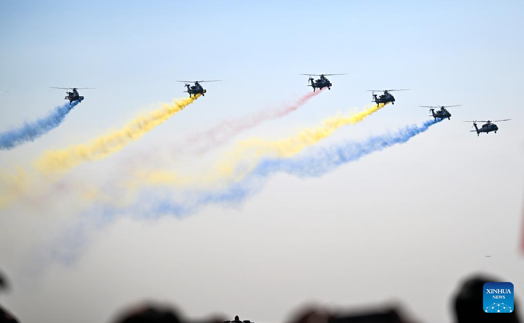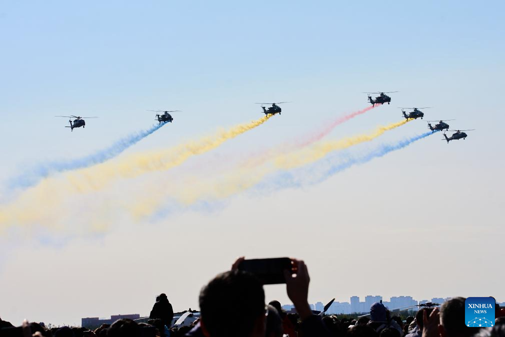Helicopters of Fenglei aerobatic team of the Chinese People's Liberation Army (PLA) perform during the 7th China Helicopter Exposition in north China's Tianjin Municipality, Oct. 18, 2025. The exposition opens to the general public on Saturday. (Xinhua/Liu Fang)