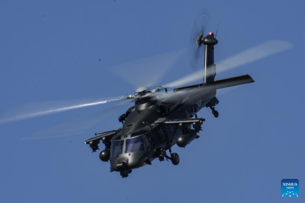 A Z-20 helicopter performs during the 7th China Helicopter Exposition in north China's Tianjin Municipality, Oct. 18, 2025. The exposition opened to the general public on Saturday. (Xinhua/Li Ran)
