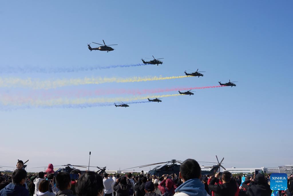 This photo taken on Oct. 18, 2025 shows an aerobatic show during the 7th China Helicopter Exposition in north China's Tianjin Municipality. The exposition opened to the general public on Saturday. (Photo by Du Penghui/Xinhua)