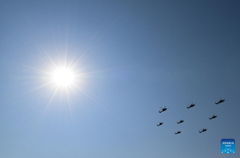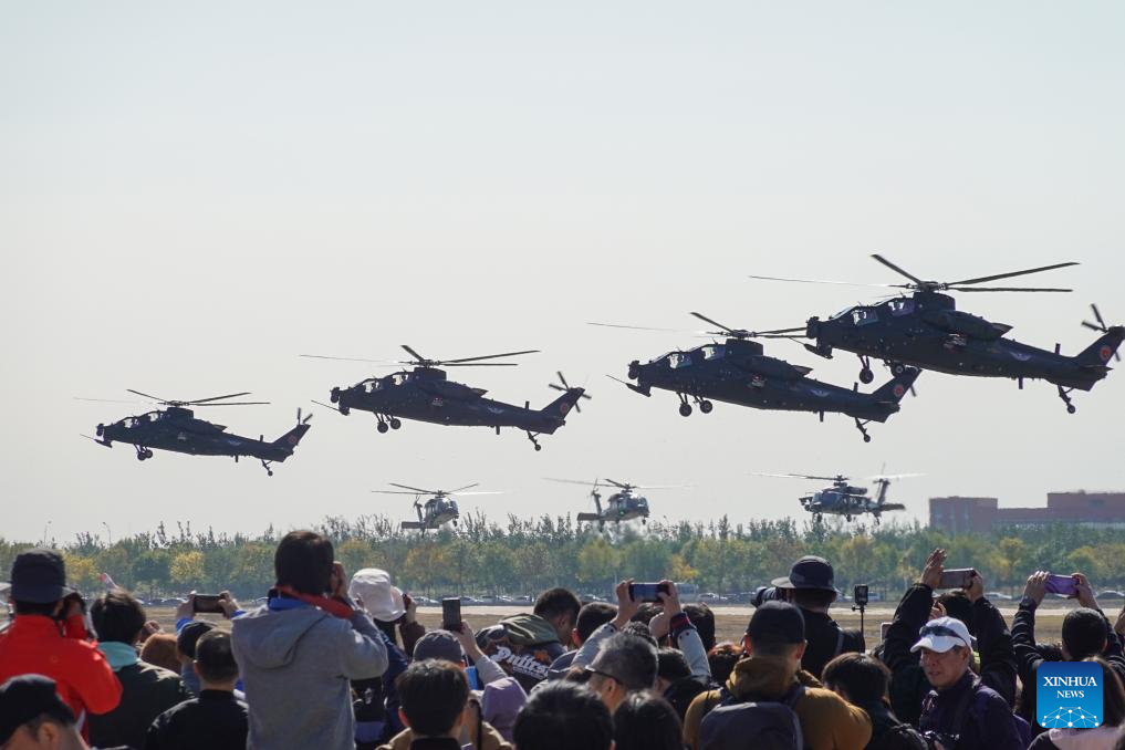 Z-10 helicopters perform during the 7th China Helicopter Exposition in north China's Tianjin Municipality, Oct. 18, 2025. The exposition opened to the general public on Saturday. (Xinhua/Li Ran)