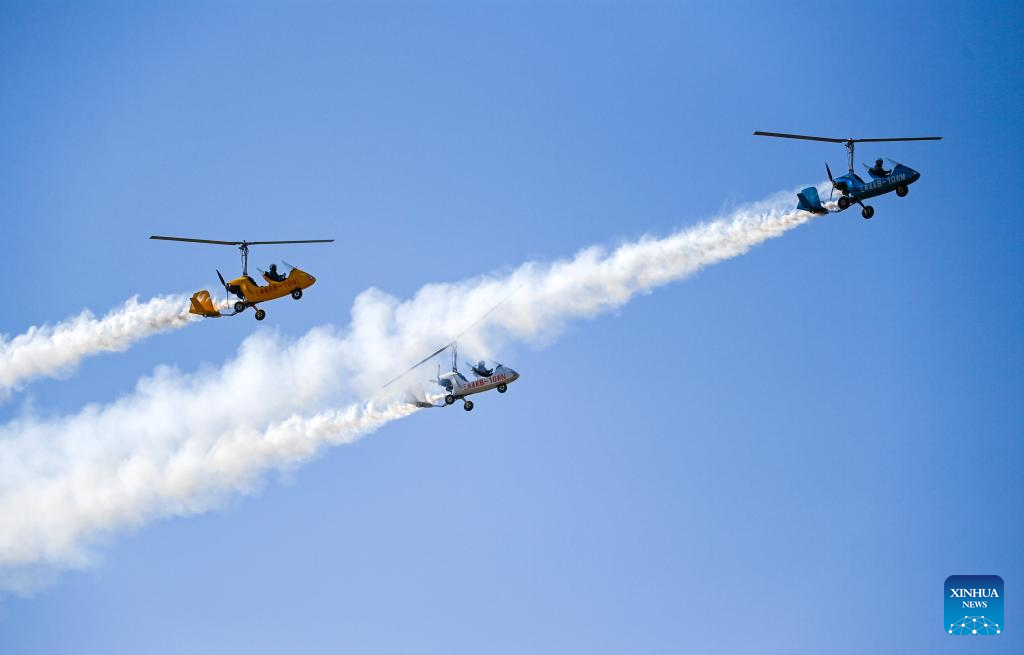Gyrocopters perform during the 7th China Helicopter Exposition in north China's Tianjin Municipality, Oct. 18, 2025. The exposition opened to the general public on Saturday. (Xinhua/Zhao Zishuo)