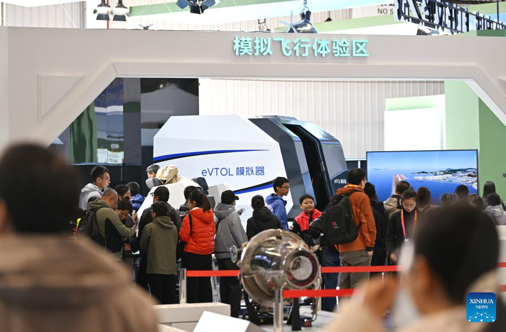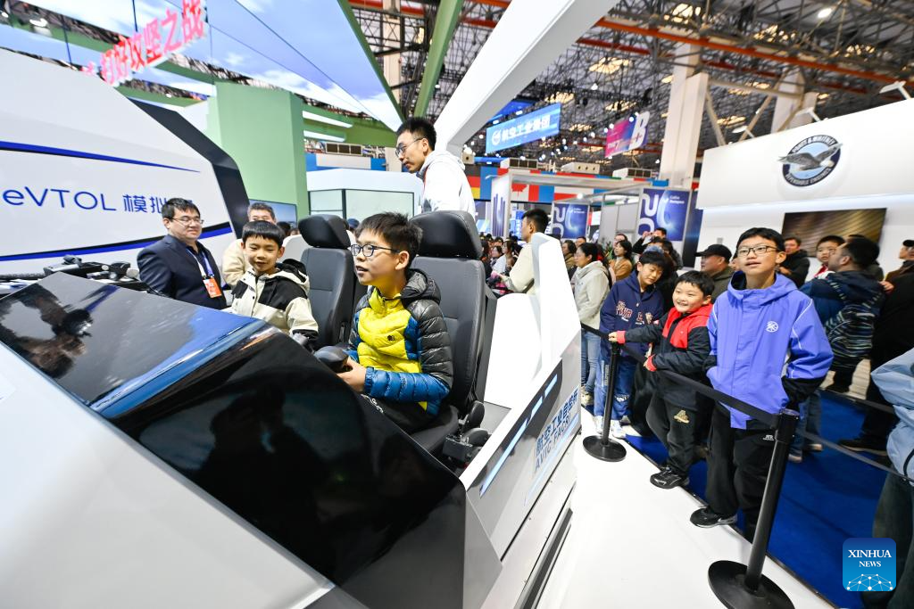 Children experience simulated flight during the 7th China Helicopter Exposition in north China's Tianjin Municipality, Oct. 18, 2025. The exposition opened to the general public on Saturday. (Photo by Du Penghui/Xinhua)