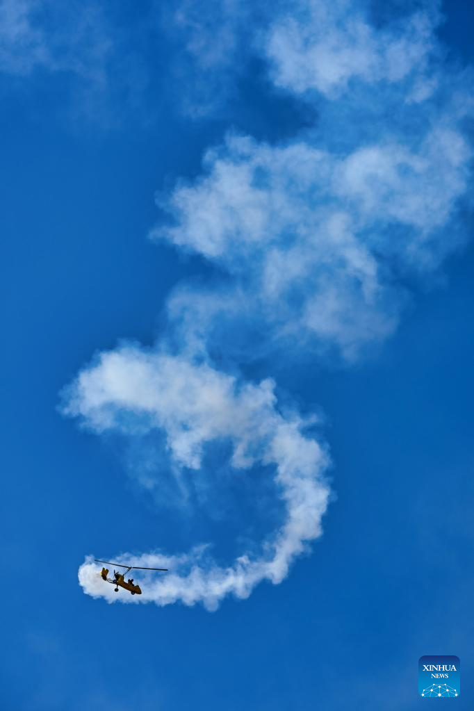 A gyrocopter performs during the 7th China Helicopter Exposition in north China's Tianjin Municipality, Oct. 18, 2025. The exposition opened to the general public on Saturday. (Xinhua/Zhao Zishuo)