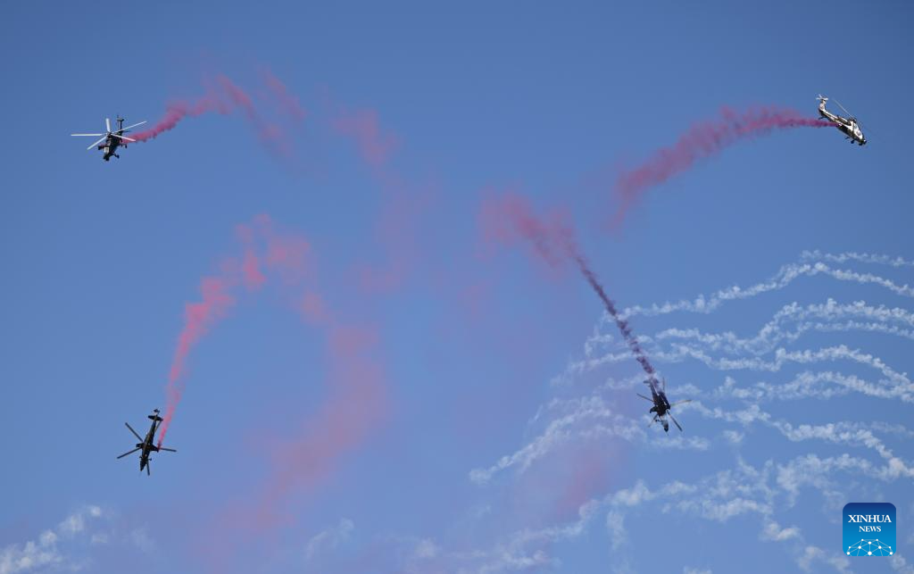 Helicopters of the Fenglei aerobatic team of the Chinese People's Liberation Army (PLA) perform during the 7th China Helicopter Exposition in north China's Tianjin Municipality, Oct. 18, 2025. The exposition opened to the general public on Saturday. (Xinhua/Sun Fanyue)