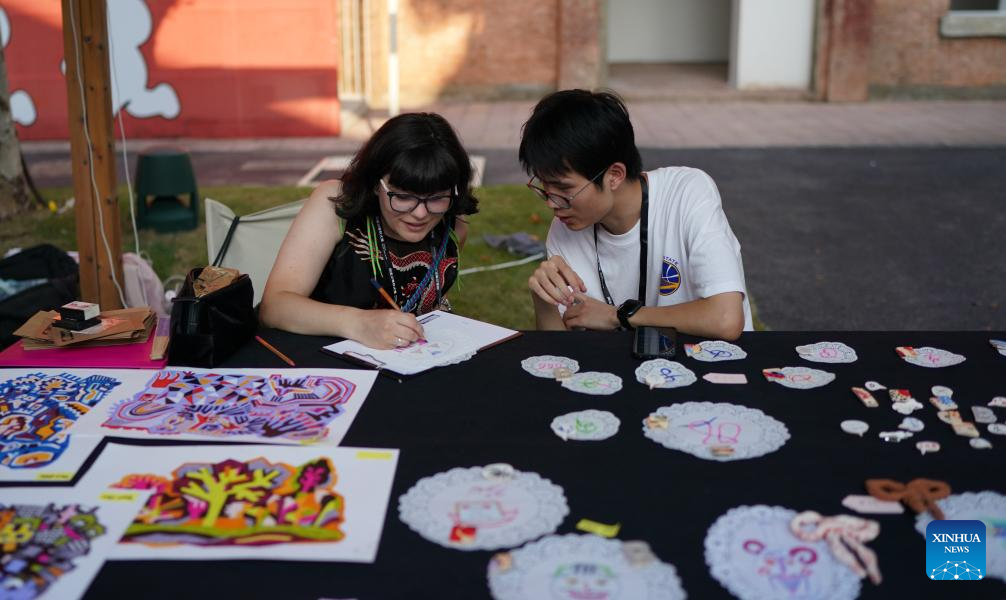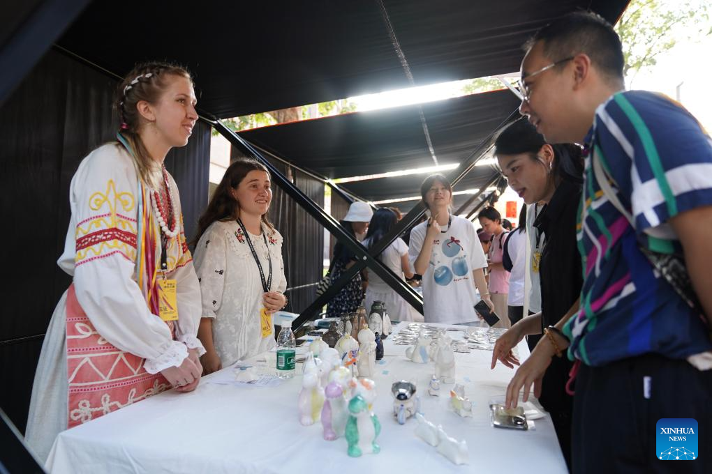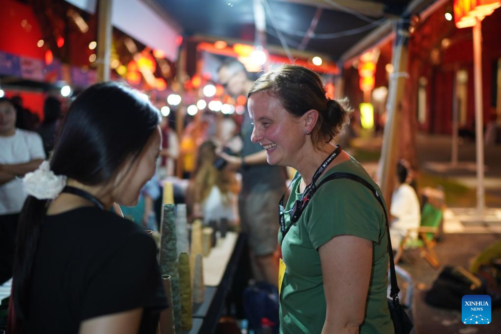 Foreign artists (L) talk to visitors at a ceramic carnival held as a sideline event of the 2025 China Jingdezhen International Ceramic Expo in Jingdezhen, east China's Jiangxi Province, Oct. 17, 2025. The 2025 China Jingdezhen International Ceramic Expo opened on Oct. 18 in Jingdezhen, an eastern Chinese city famed as the "porcelain capital," attracting more than 1,000 buyers from home and abroad. (Xinhua/Zhou Mi)