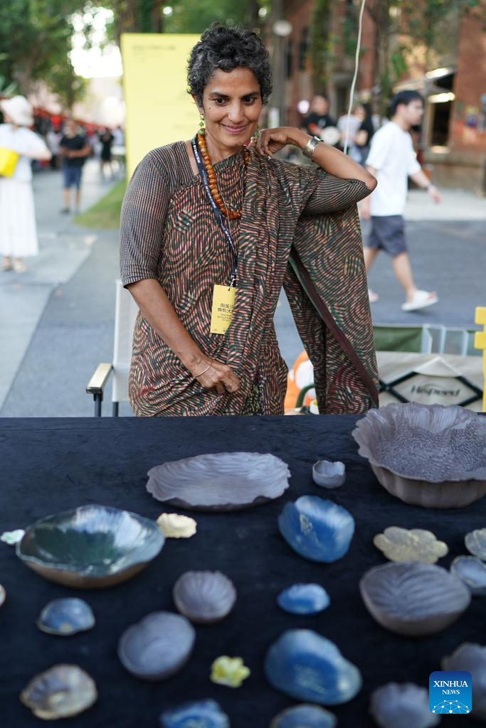 An artist from India displays her works at a ceramic carnival held as a sideline event of the 2025 China Jingdezhen International Ceramic Expo in Jingdezhen, east China's Jiangxi Province, Oct. 17, 2025. The 2025 China Jingdezhen International Ceramic Expo opened on Oct. 18 in Jingdezhen, an eastern Chinese city famed as the "porcelain capital," attracting more than 1,000 buyers from home and abroad. (Xinhua/Zhou Mi)