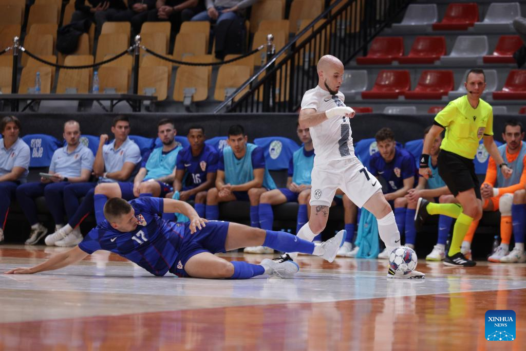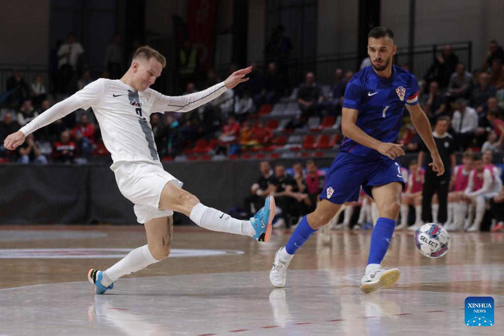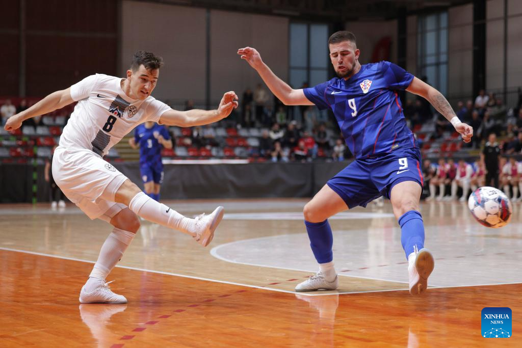 Luka Cop (front L) of Slovenia competes during a friendly match before the UEFA Futsal Euro2026 between Slovenia and Croatia in Ljubljana, Slovenia, Oct. 17, 2025. (Photo by Zeljko Stevanic/Xinhua)