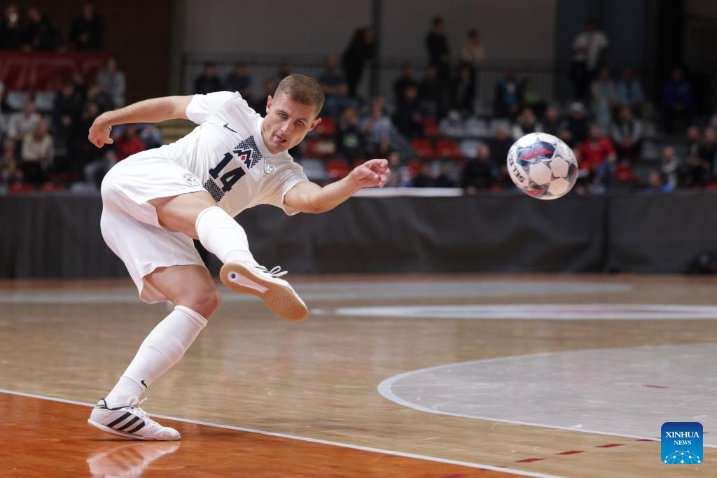 Matej Fidersek of Slovenia shoots during a friendly match before the UEFA Futsal Euro2026 between Slovenia and Croatia in Ljubljana, Slovenia, Oct. 17, 2025. (Photo by Zeljko Stevanic/Xinhua)