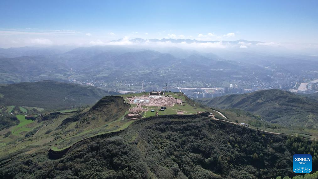 A drone photo taken on Oct. 15, 2025 shows a view of the Sijiaoping site in Lixian County, Longnan City of northwest China's Gansu Province. Located in Lixian County, Longnan City of Gansu, the Sijiaoping site is a large-scale ritual building complex designed with a symmetrical layout.