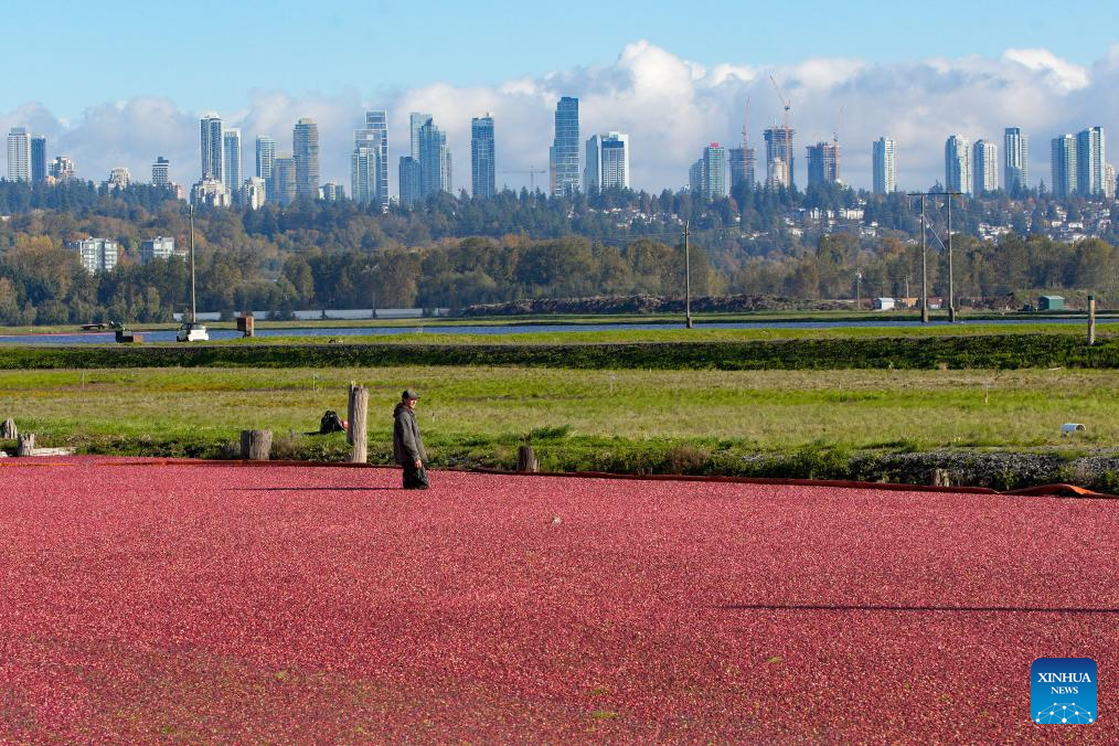 A worker harvests cranberries with a specialized machine at a cranberry farm in Richmond, British Columbia, Canada, Oct. 17, 2025. Richmond is one of the major cranberry-producing areas in Canada, where the harvest typically runs from late September to early November. (Photo by Liang Sen/Xinhua)