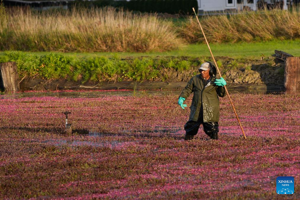 A worker wades through floating cranberries at a cranberry farm in Richmond, British Columbia, Canada, Oct. 17, 2025. Richmond is one of the major cranberry-producing areas in Canada, where the harvest typically runs from late September to early November. (Photo by Liang Sen/Xinhua)