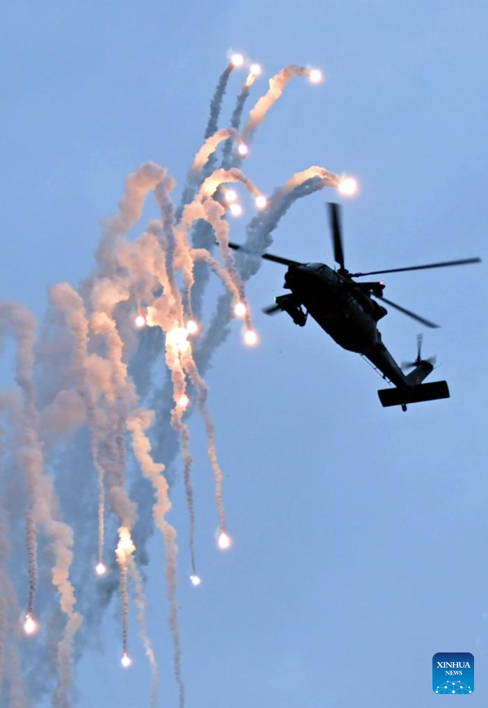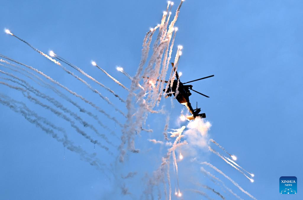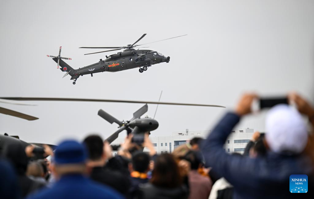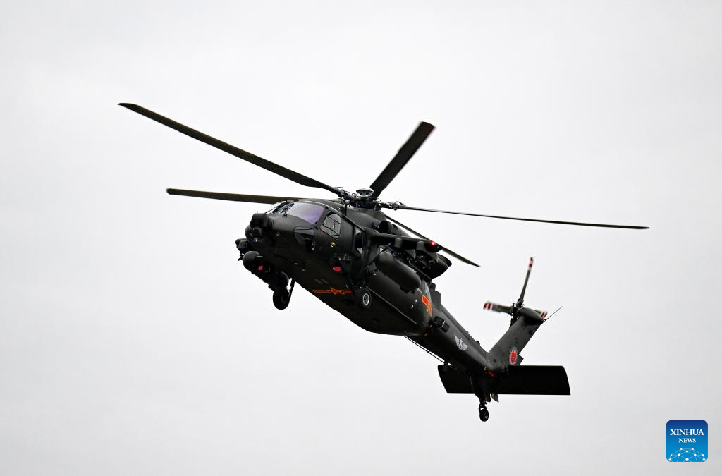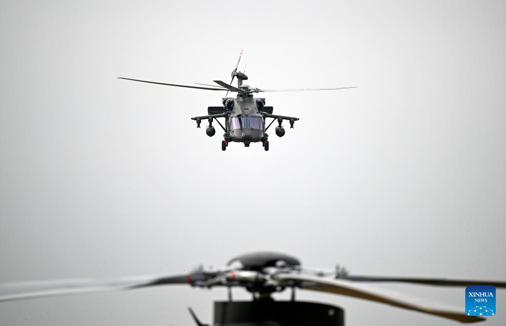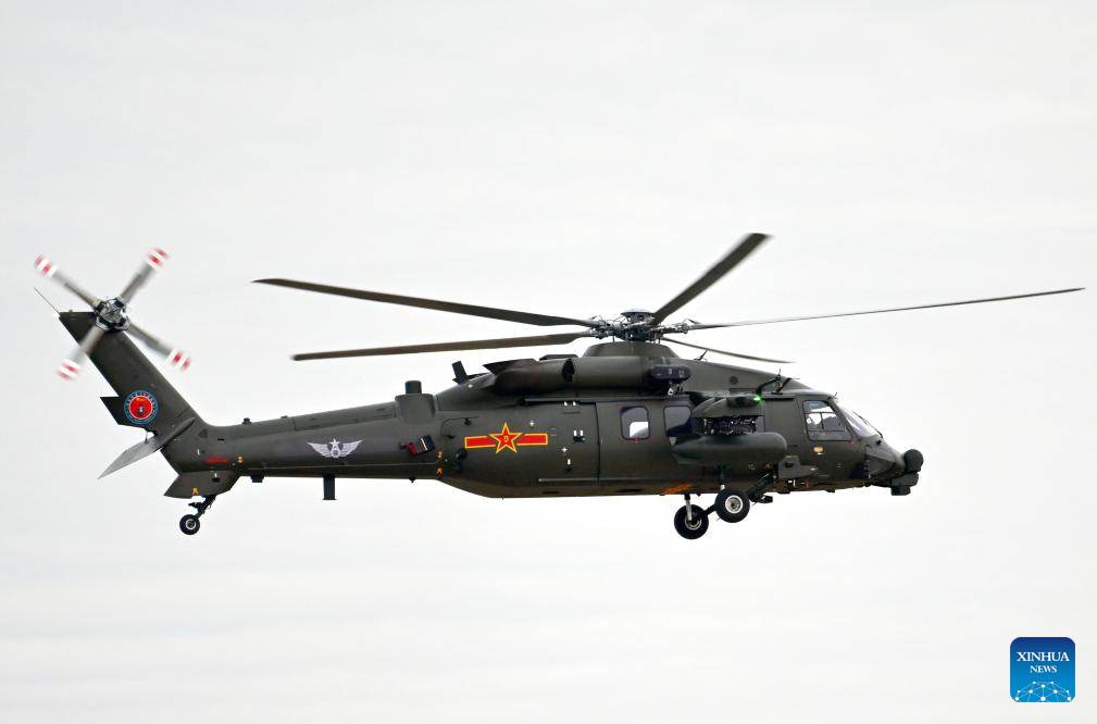 A Z-20T helicopter performs during the 7th China Helicopter Exposition in north China's Tianjin Municipality, Oct. 17, 2025. The exposition opened on Thursday in north China's Tianjin Municipality, featuring an expanded low-altitude economy exhibition area and debuting multiple military helicopters, civilian helicopters and other low-altitude aircraft. (Xinhua/Zhao Zishuo)