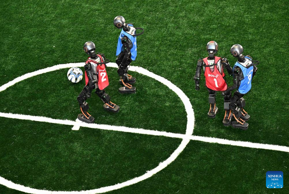 Robots are pictured during a football game at the International Convention and Exhibition Center in Shijiazhuang, north China's Hebei Province, Oct. 17, 2025. The 2025 China Robot Competition and RoboCup China Open are held here from Friday to Sunday. (Photo by Chen Qibao/Xinhua)