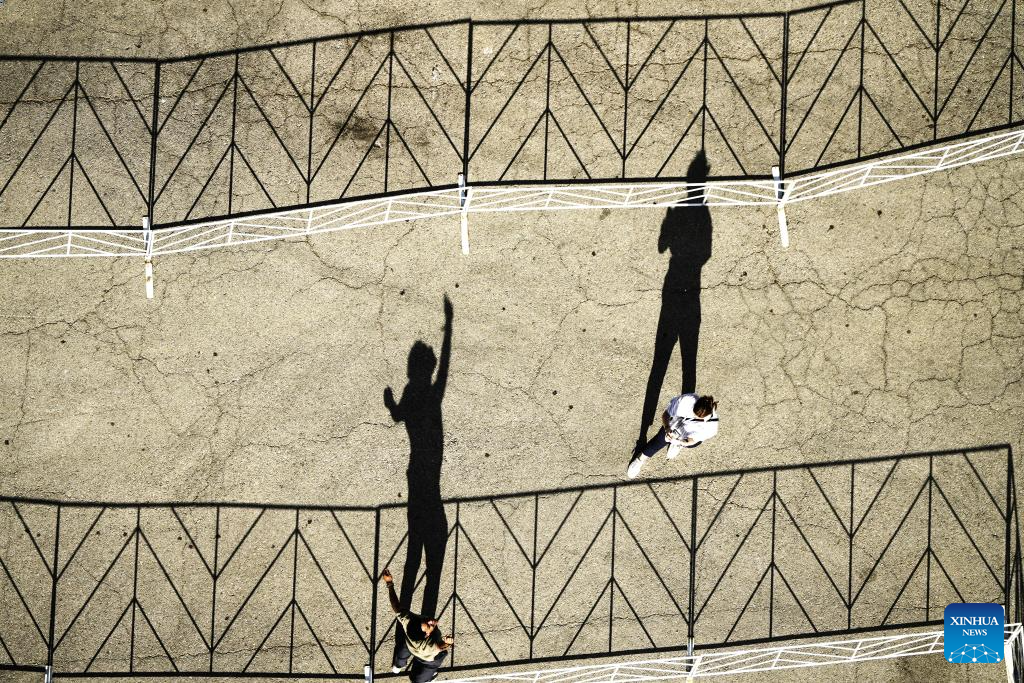 Shadows of people are projected on the ground at sunset in Austin, Texas, the United States, Oct. 17, 2025. (Xinhua/Wu Xiaoling)